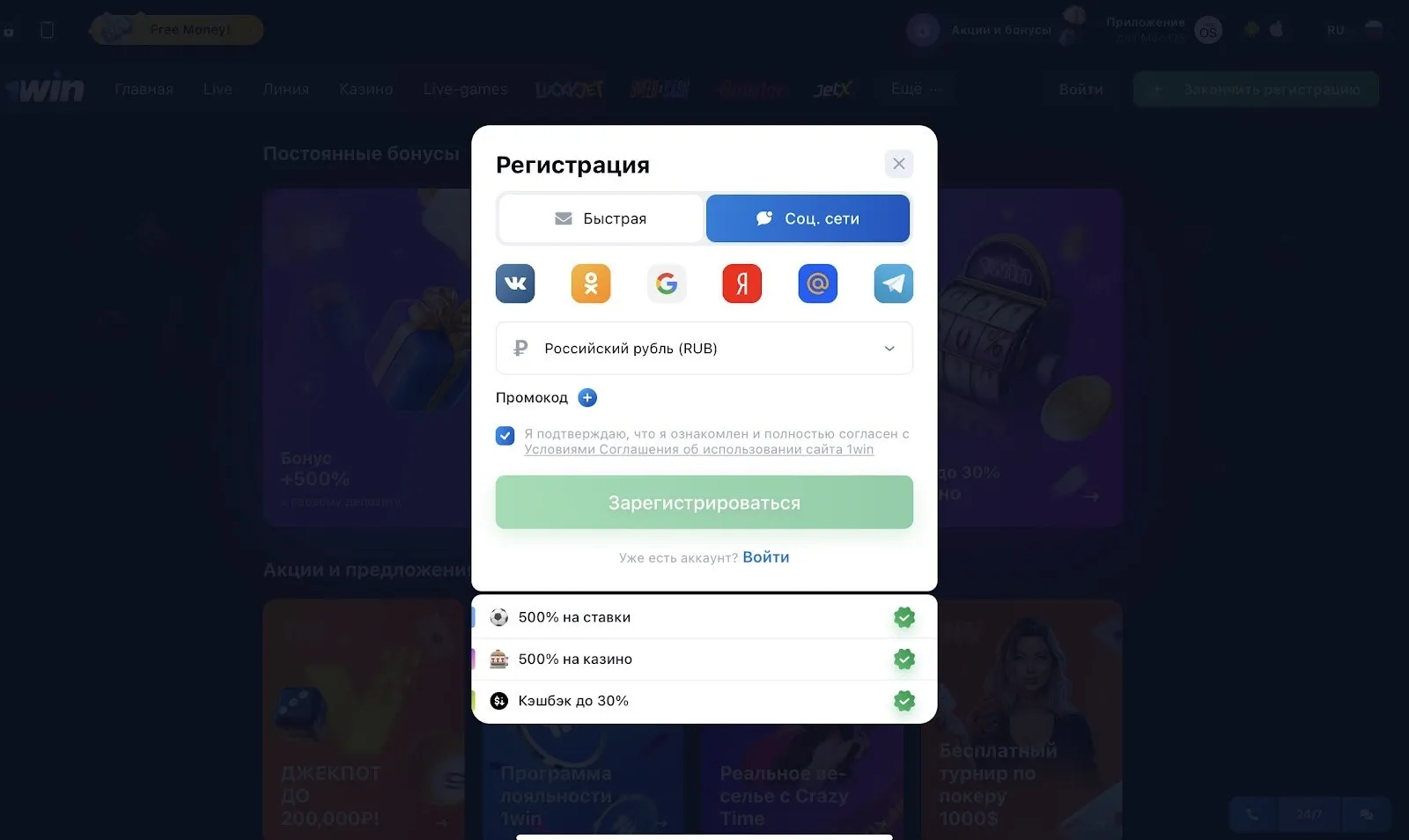 Регистрация 1win