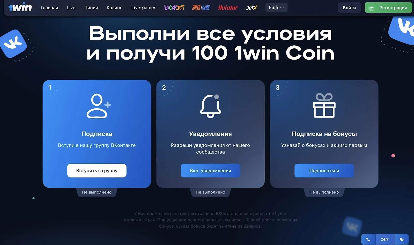 Ознакомиться с системой акций можно на официальном сайте в специальном разделе. Кстати, новичок уже может получить 100 вин-коинов просто так. Для этого нужно оформить подписку на паблик 1win ВКонтакте.